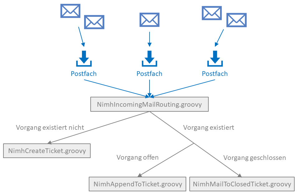 Wenn der Vorgang, für den die E-Mail eingeht, wieder geöffnet werden soll, anstatt einen neuen Vorgang zu erstellen, müssen Sie eine Aktivität zum Wiedereröffnen in den Workflow einbauen und NimhIncomingMailRouting.groovy anpassen, um den Vorgang wieder zu öffnen und NimhAppendToTicket.groovy aufzurufen.