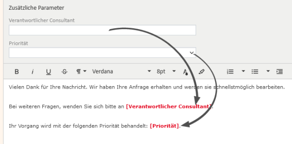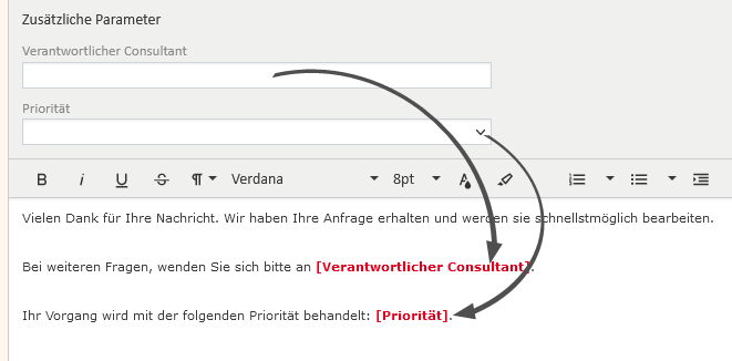 Textvorlagen können Variablen enthalten, die mit Daten aus dem Vorgang, in dem die Vorlage verwendet wird, gefüllt werden. Mit Variablen können Vorgangsdaten, die Daten des Kontakts oder Bearbeiters des Vorgangs oder die Daten des aktuellen Benutzers eingefügt werden.