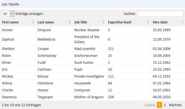 Tabellen-Widgets werden im Typ tableWidget oder einem seiner Unterelemente konfiguriert. Sie verwenden die Bibliothek DataTables.