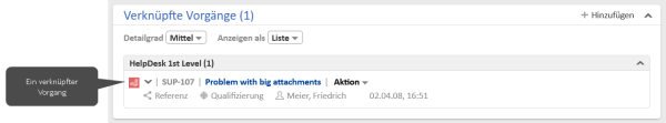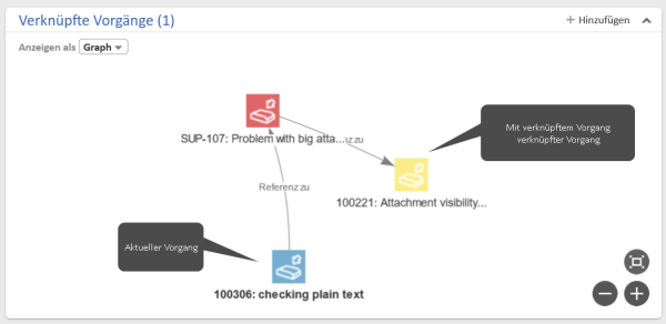 Die folgenden Abbildungen zeigen den Abschnitt Verknüpfte Vorgänge eines Vorgangs im Listen- und Graphenmodus. Im Graphenmodus wird auch ein Vorgang angezeigt, der nicht mit dem aktuellen Vorgang verknüpft ist, sondern mit einem verknüpften Vorgang.