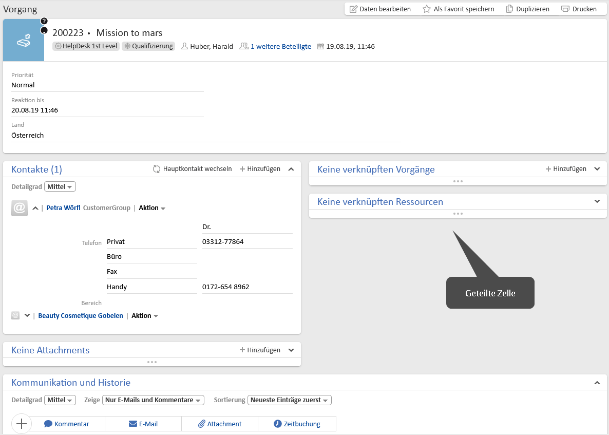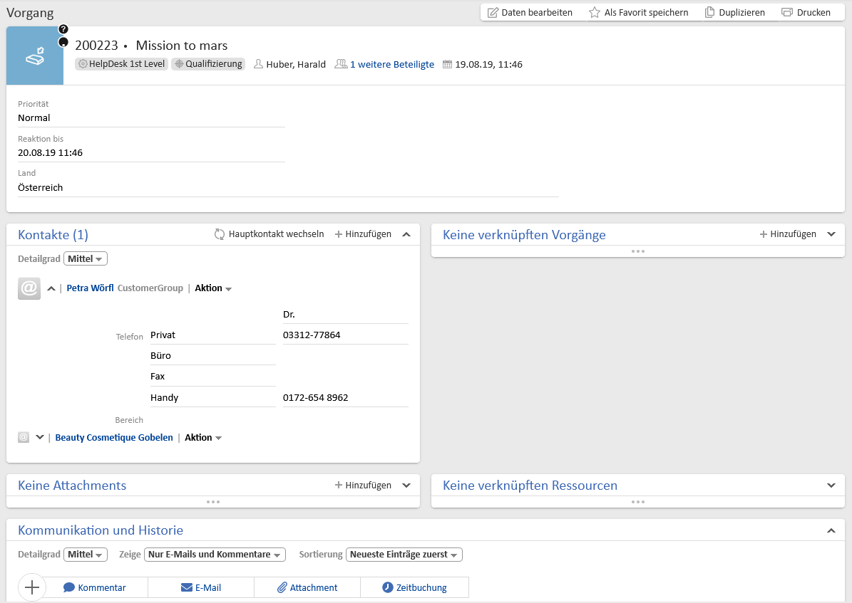 Seite mit den Vorgangsdetails: customfields, customers, relations, calendar, resources, history, attachments