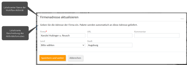 Die lokalisierte Beschreibung des Aktivitätsformulars. Wird unter dem Aktivitätsnamen im Web Client angezeigt.Die Beschreibung kann im Vorbelegungsskript des Aktivitätsformulars im Workflow geändert werden, siehe Ändern der Beschreibung.